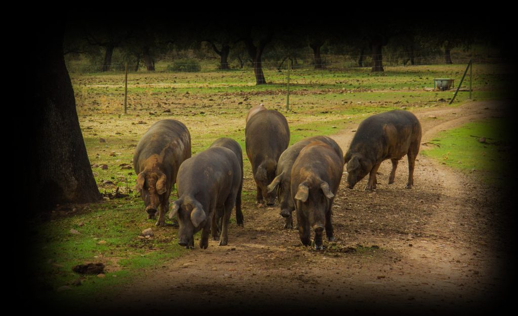 Trabajamos con cerdos de raza ibérica —muchos de ellos 100 % puros— criados en libertad plena o semi-libertad, en un entorno natural que favorece el bienestar, la salud y el desarrollo de una carne excepcional. Alimentados con bellotas, pastos naturales o piensos seleccionados, nuestros animales son el primer eslabón de una cadena que cuida cada detalle.